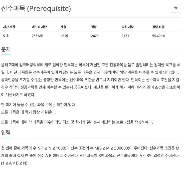 3개의 과목이 있고, 2번 과목을 이수하기 위해서는 1번 과목을 이수해야 하고, 3번 과목을 이수하기 위해서는 2번 과목을 이수해야 한다.