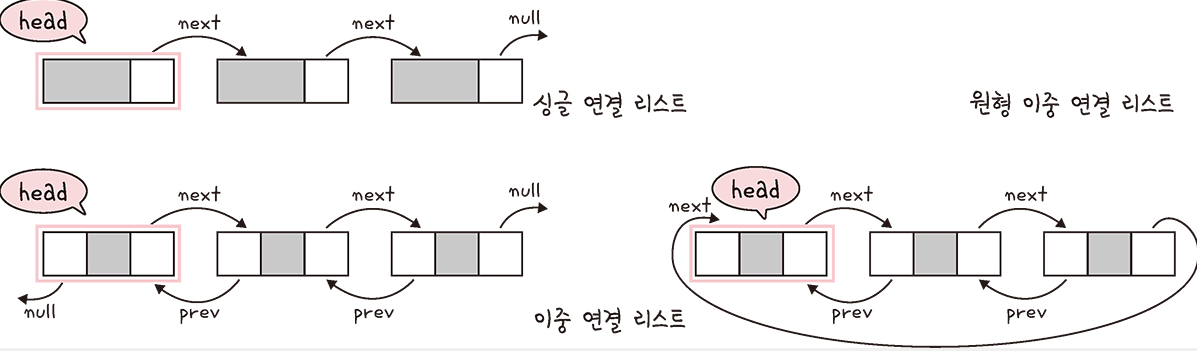 - 원형 이중 연결 리스트 : 이중연결리스트와 같지만 마지막 노드의 next 포인터가 헤드 노드를 가리킨다.