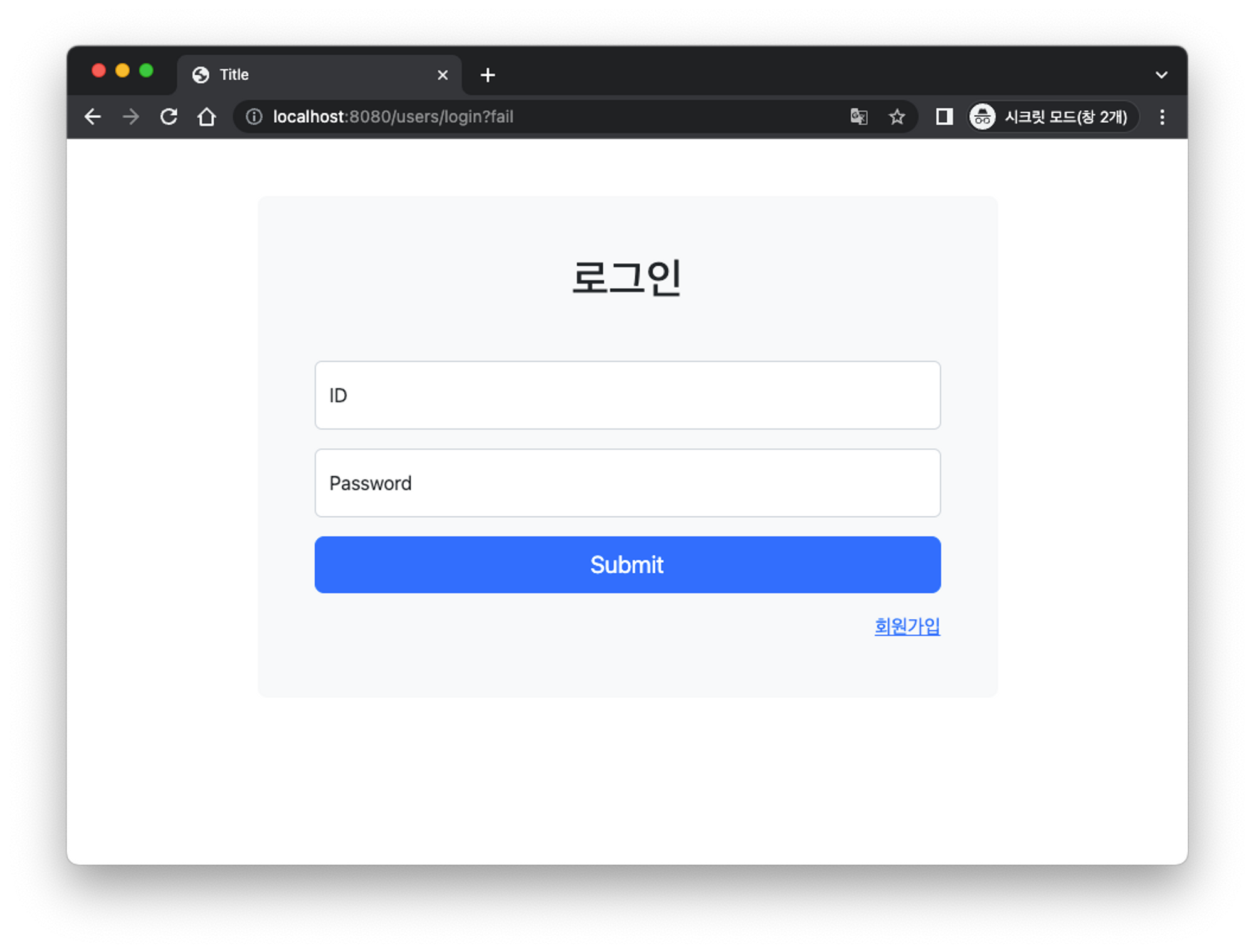 - 만약 사용자의 정보(아이디 혹은 비밀번호)가 틀렸다면 http://localhost:8080/users/login?fail로 넘어가며 재로그인 화면이 나오는 걸 확인할 수 있다.