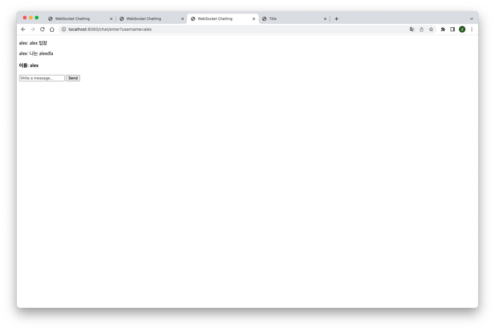 이제 채팅방 입장을 위한 rooms.html과, 실제 채팅을 진행하기 위한 chat.html을 작성 후 반환하는 컨트롤러를 작성해서 채팅방에 입장하여 채팅을 진행할 수 있습니다.