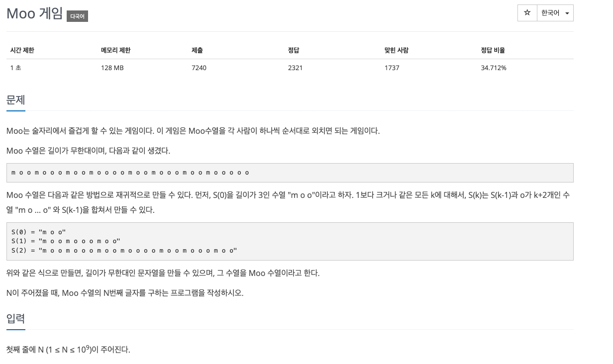 Moo는 술자리에서 즐겁게 할 수 있는 게임이다. 이 게임은 Moo수열을 각 사람이 하나씩 순서대로 외치면 되는 게임이다. Moo 수열은 길이가 무한대이며, 다음과 같이 생겼다. m o o m o o o m o o m o o o
