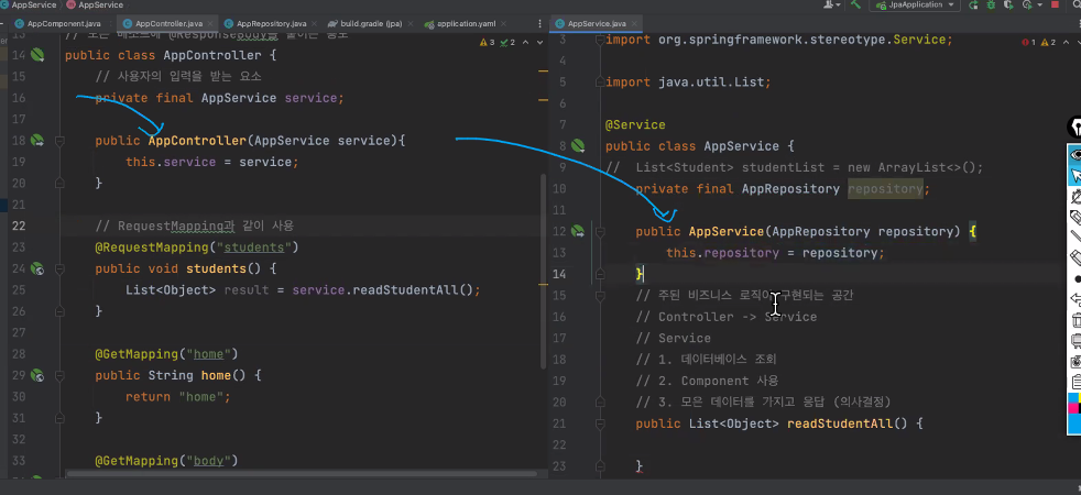 - @Service는 주된 비즈니스 로직이 구현되는 공간임