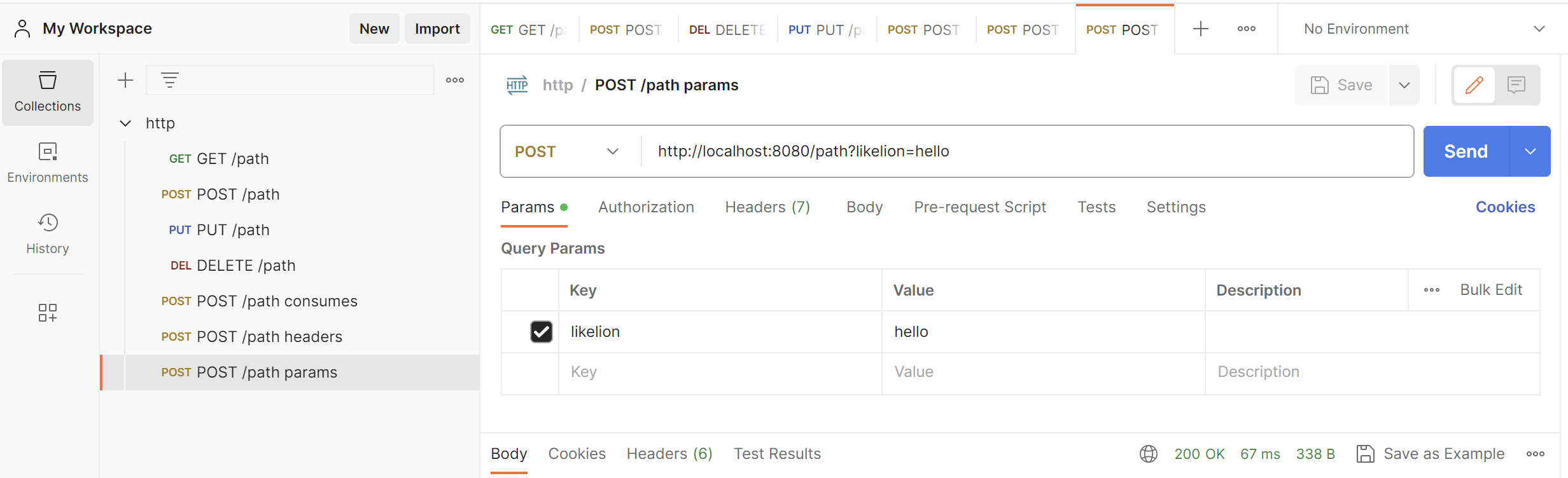 '/path'로 오는 POST 요청이면서 Query Parameter로 likelion이 hello로 할당되어 있을 때 메소드를 실행하고 싶을 때